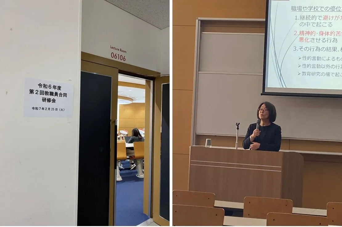 今回は2月25日(火)に広島大学ハラスメント相談室客員教授の横山美栄子先生をお招きして、「キャンパスハラスメントの防止と対策-安心して学べるキャンパスのために-」と題してご講演いただきました。講演では、なぜハラスメント防止対策が必要か、ハラスメントをめぐる最近の変化、教育・研究の場における視点や対応のポイントなど多くの内容をお話いただきました。学生が「この大学で学ぶことができてよかった」「この先生と出会えてよかった」と思える経験をして卒業させることが大学の責任であるとおっしゃられていたのが印象的でした。