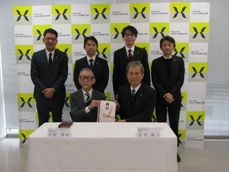 寄贈式には、毛利アークハード株式会社様の毛利代表取締役をはじめ、広島信用金庫祇園支店の田中支店長ほか、宮谷学長を含む本学の関係者が出席しました。