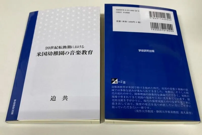 子ども発達教育学科の迫 共准教授による研究書、『20世紀転換期の米国幼稚園における音楽教育』(学術研究出版)が刊行されました。